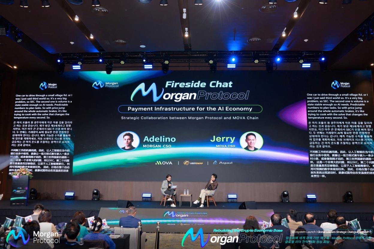 Following the two major keynote addresses, the summit moved into a highly anticipated fireside dialogue centered on “Payment Infrastructure for the AI Economy: Strategic Synergy Between Morgan Protocol and MOVA Chain.” Mr. Jerry, CSO of MOVA, and Mr. Adelino, CSO of Morgan Protocol, engaged in an in-depth one-on-one discussion. Mr. Jerry precisely highlighted the core pain points in AI-economy payments, while Mr. Adelino responded with vivid analogies—describing existing financial systems as race cars forced to drive on rural roads, asset volatility as sudden temperature swings on a stovetop, and cross-border compliance as constantly changing traffic rules. He further elaborated on Morgan Protocol’s design philosophy of “compliance-first, machine-first, and globally native,” which aligns closely with MOVA’s ecosystem strategy.